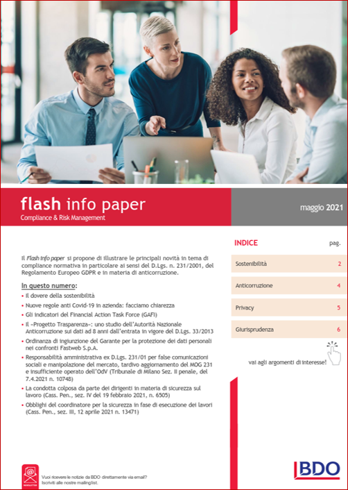 Il Flash Info Paper si propone di illustrare le principali novità in tema di compliance normativa in particolare ai sensi del D.Lgs. n. 231/2001, del Regolamento Europeo GDPR e in materia di anticorruzione
