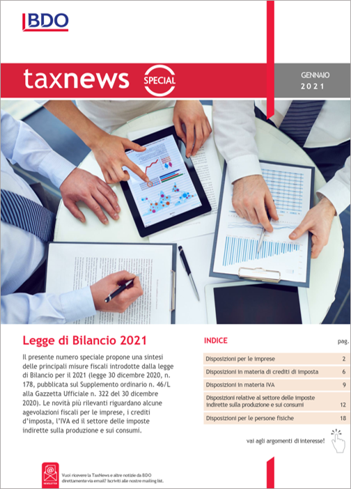 Il presente numero speciale propone una sintesi delle principali misure fiscali introdotte dalla legge di Bilancio per il 2021 (legge 30 dicembre 2020, n. 178, pubblicata sul Supplemento ordinario n. 46/L alla Gazzetta Ufficiale n. 322 del 30 dicembre 2020).