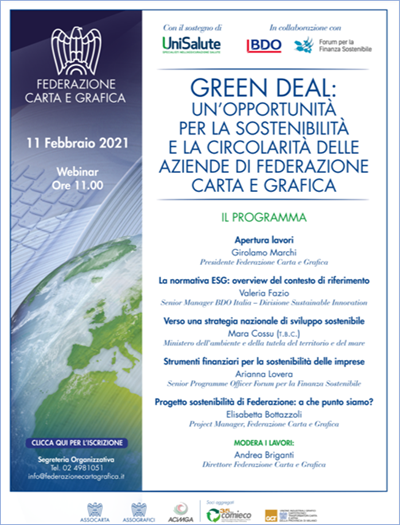 Federazione Carta e Grafica Confindustria, in collaborazione di BDO e Forum per la Finanza Sostenibile, con il sostegno di UniSalute, organizza il webinar "GREEN DEAL: un'opportunità per la sostenibilità e la circolarità delle aziende di Federazione Carta e Grafica"