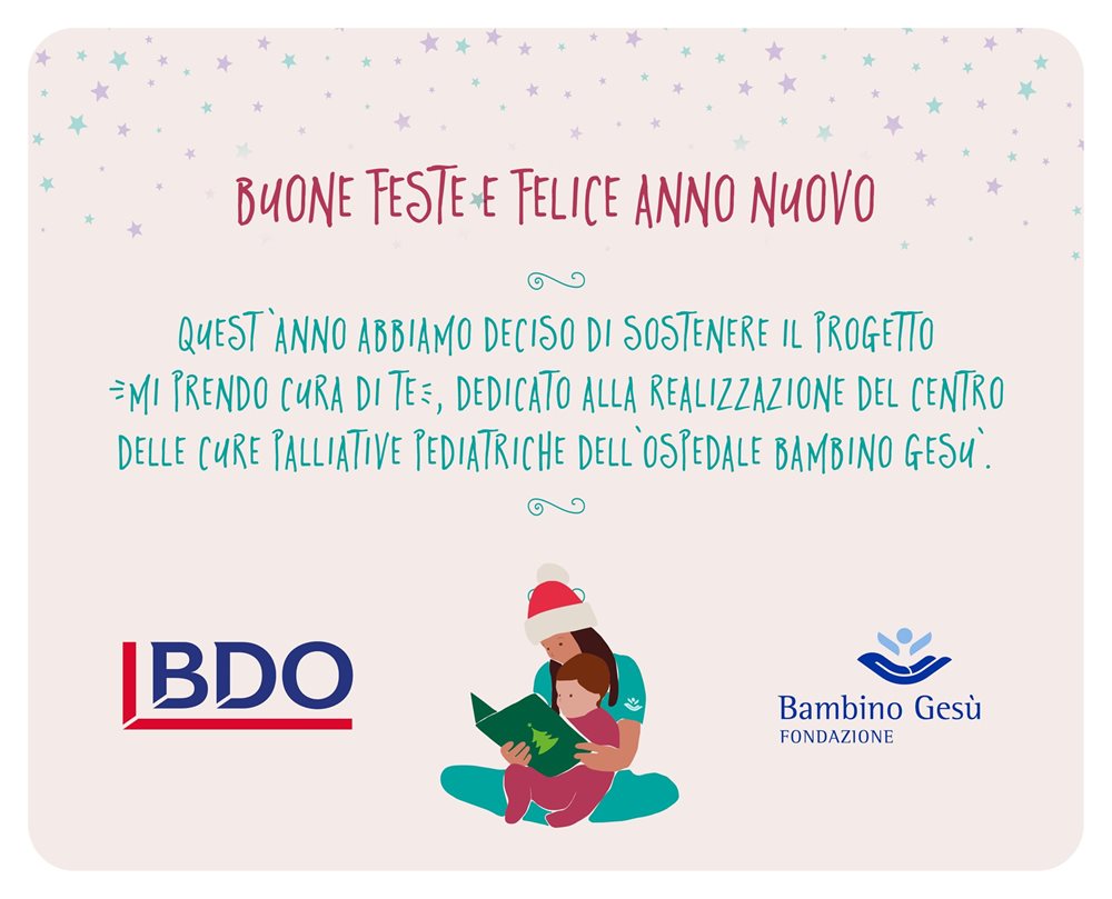 Quest’anno abbiamo deciso di sostenere la campagna "MI PRENDO CURA DI TE" della Fondazione Bambino Gesù Onlus dedicata alla realizzazione e completamento del Centro delle Cure Palliative Pediatriche del Bambino Gesù, sorto nella nuova sede di Passoscuro vicino Roma. Una nuova struttura che nasce per assistere i tanti bambini affetti da gravi patologie croniche, che insieme alle loro famiglie si rivolgono con fiducia all'Ospedale Pediatrico.