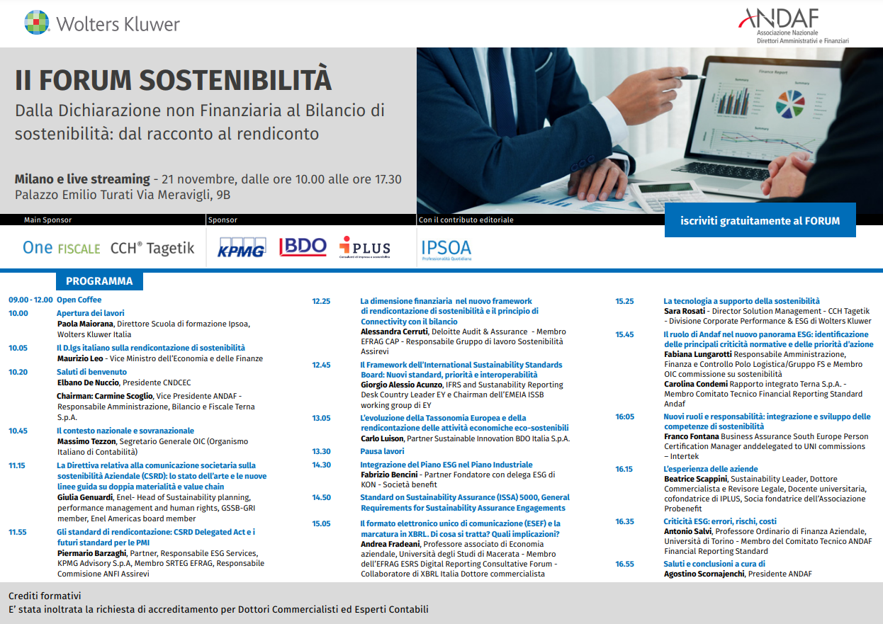 BDO è sponsor dell'appuntamento promosso da Wolters Kluwer e ANDAF che rappresenta un importante momento di confronto e un’opportunità formativa in cui verranno analizzate le ipotesi evolutive degli standard di rendicontazione della sostenibilità